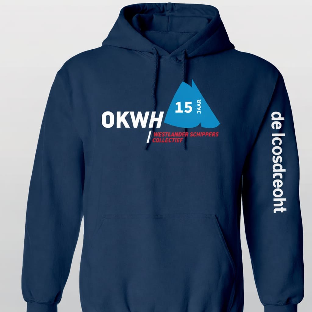Om het 15-jarig jubileum te markeren, hebben we dit jaar weer officiële OKWH-merchandise laten maken. Een navy blauwe hoodie met het jubileumlogo, 15 JAAR inclusief opdruk met de scheepsnaam op de mouw.